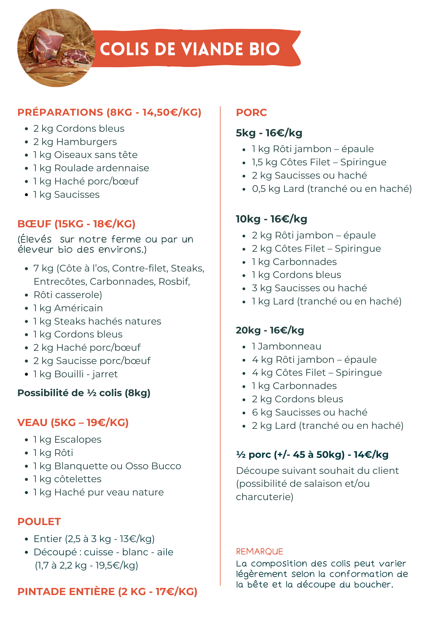 De mai à décembre nous proposons, sur réservation, des colis de porc en 5, 10, 20 kg ou par demi-cochon, du bœuf en 8 ou 15 kg, du veau, des préparations, des poulets ou encore des pintades !