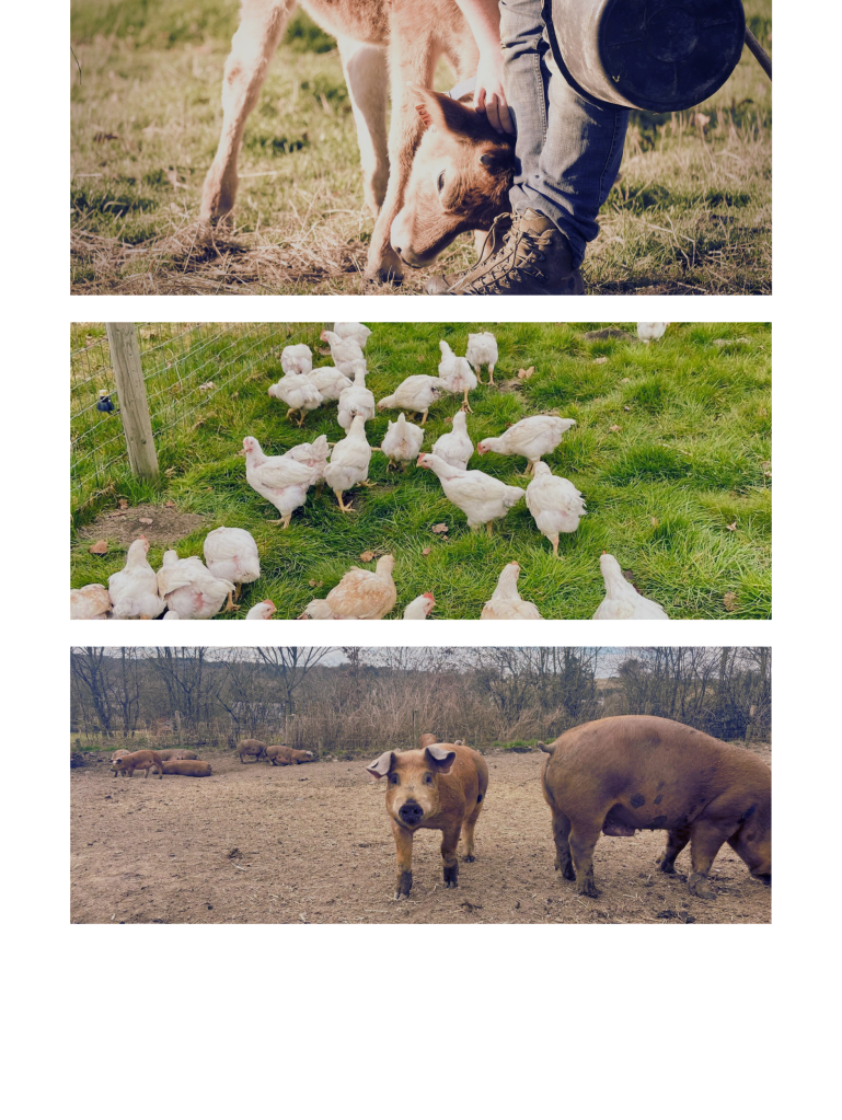 Vaches, cochons et poulets vivent en plein air, nourris avec des aliments bio et le surplus de notre production laitière. Nous veillons à leur offrir des conditions de vie sereines et des soins attentifs. Ces conditions d’élevage donnent une viande d’une qualité exceptionnelle tant au niveau nutritionnel que gustatif.